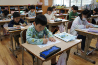 国語では、ひらがなプリントが始まりました。姿勢よく、丁寧になぞったり、書いたりしています。運筆力アップのためにも、色塗りまでするようにしています。継続は力です!今は時間がかかるかもしれませんが、少しずつ上手になってくるので、御家庭でも応援してあげてくださいね☆